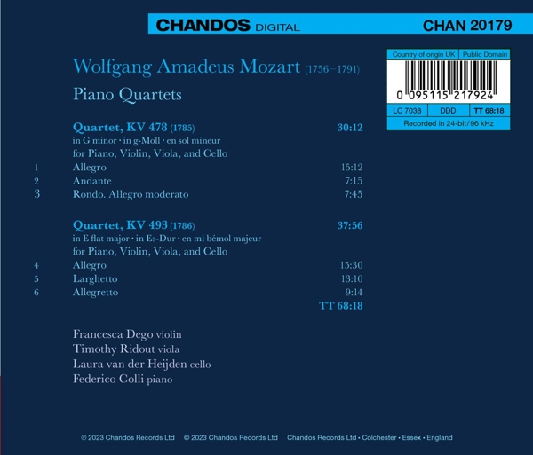 Piano Quartet No. 1, K. 478 01. "I. Allegro" 02. "II. Andante" 03. "III. Rondo" Piano Quartet No. 2, K. 493 04. "I. Allegro" 05. "II. Larghetto" 06. "III. Allegretto"