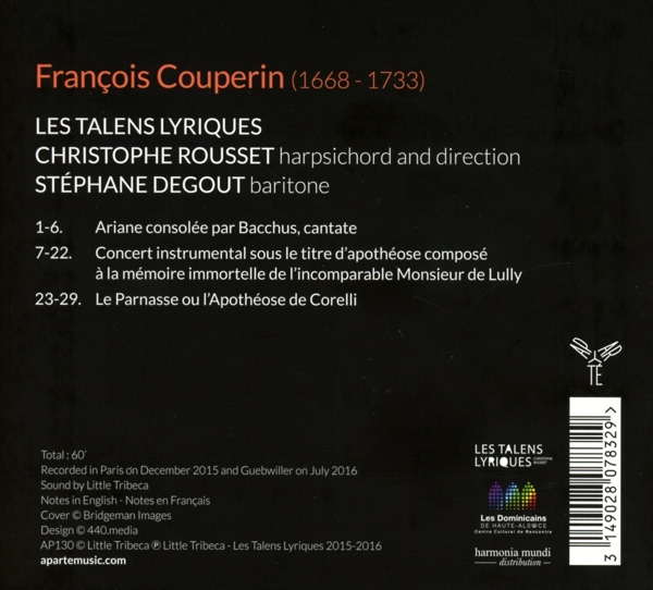 Ariane consol?e par Bacchus (Kantate) 01. "Rezitativ" 02. "Arie" 03. "Rezitativ" 04. "Arie" 05. "Rezitativ" 06. "Arie" L'Apoth?ose de Lully (Concert instrumental, Triosonate) 07. "1. Lully aux Champs lys?es, concertant avec les Olbres lyriques (Apoth?ose de Lully)" 08. "2. Air pour les m?mes" 09. "3. Vol de Mercure aux Champs lys?es pour avertir qu'Apollon y va descendre" 10. "4. Descente d'Apollon qui vient offrir son violon ? Lully et sa place au Parnasse" 11. "5. Rumeur souterraine, caus?e par les auteurs contemporains de Lully" 12. "6. Plaintes des m?mes pour des fl?tes ou des violons tr?s adoucis" 13. "7. Enl?vement de Lully au Parnasse" 14. "8. Accueil entre doux et hagard, fait ? Lully par Corelli et par les muses italiennes" 15. "9. Remerciement de Lully ? Apollon" 16. "10. Lully et les muses fran?aise, Corelli et les muses italiennes (Apollon persuade Lully et Corelli que le r?union..." 17. "11. Lully jouant le sujet, et Corelli l'accompagnant" 18. "12. Corelli jouant le sujet ? son tour, que Lully accompagne" 19. "13. Sonade en trio (La paix du Parnasse, faite aux conditions, sur la remontrance des muses fran?aises..." 20. "14. Saillie" 21. "15. Rondement" 22. "16. Vivement" L'Apoth?ose de Corelli (Le Parnasse) (Triosonate) 23. "1. Corelli au pied du Parnasse prie les muses de le recevoir parmi elles" 24. "2. Corelli charm? de la bonne r?ception qu'on lui fait au Parnasse, en marque sa joie" 25. "3. Corelli buvant ? la source d'Hippocr?ne. Sa troupe continue" 26. "4. Enthousiasme de Corelli caus? par les eaux d'Hippocr?ne" 27. "5. Corelli, apr?s son enthousiasme, s'endort" 28. "6. Les muses r?veillent Corelli et le placent aupr?s d'Apollon" 29. "7. Remerciement de Corelli"
