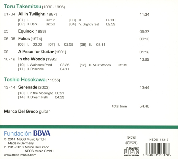 All in Twilight (4 Stücke für Gitarre) (1987) 01. "Nr. 1 (keine Angaben)" 02. "Nr. 2 Dark" 03. "Nr. 3 (keine Angaben)" 04. "Nr. 4 Slightly fast" 05. "Equinox (für Gitarre) (1993)" Folios (für Gitarre) (1974) 06. "1. (ohne Satzbezeichnung)" 07. "2. (ohne Satzbezeichnung)" 08. "3. (ohne Satzbezeichnung)" 09. "A Piece for Guitar (1991)" In the woods (für Gitarre) (1995) 10. "1. Wainscot pond" 11. "2. Muir woods" 12. "3. Rosedale" Serenade (für Gitarre) (2003) 13. "1. In the moonlight" 14. "2. Dream path"