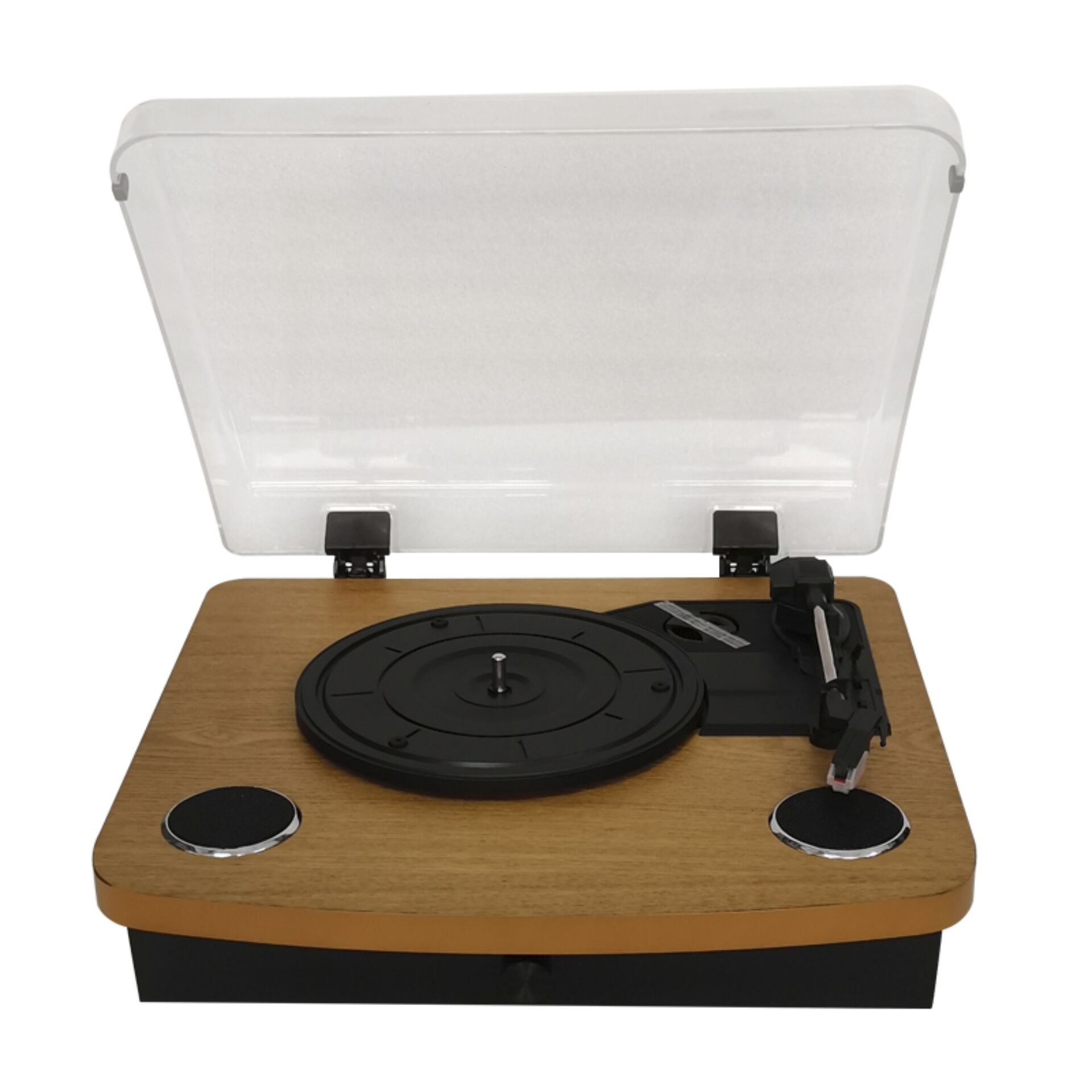 Beschreibung:Hauptmerkmale Merkmale Betrieb Halbautomatisch Produktfarbe Schwarz, Holz Gehäusematerial Kunststoff, Holz Nominale Geschwindigkeit 33 1/3,45,78 U/min Plattenteller Schnelligkeit 33 1/3,45,78 U/min Lautstärkeregler Drehregler Konvertierfunktion Ja Umwandlungsquelle Schallplatte Kompatible Speicherkarten SD Playback MP3 Ja Autostop Ja Ein-/Ausschalter Ja Anschlüsse und Schnittstellen Anzahl der USB-Anschlüsse 1 USB-Version 2.0 USB-Stecker USB Typ-A Bluetooth Ja Audio (L,R) Out 1 AUX-Eingang Ja Lautsprecher Anzahl der Lautsprecher 2 RMS-Leistung 2 W Leistung Netzteiltyp Gleichstrom Gewicht und Abmessungen Breite 376 mm Tiefe 370 mm Höhe 125 mm Gewicht 3,75 kg
