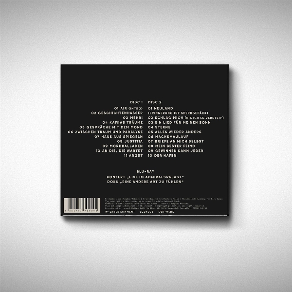 Disc 03 01. "Air (von Johann Sebastian Bach)" 02. "Geschichtenhasser" 03. "Mehr!!" 04. "Kafkas Tr?ume" 05. "Gespr?che mit dem Mond" 06. "Zwischen Traum und Paralyse" 07. "Haus aus Spiegeln" 08. "Justitia" 09. "Mordballaden" 10. "An die, die wartet" 11. "Angst" 12. "Neuland (Erinnerung ist Sperrgep?ck)" 13. "Schlag mich (bis ich es versteh')" 14. "Ein Lied für meinen Sohn" 15. "Sterne" 16. "Alles wieder anders" 17. "Machsmaulauf" 18. "Briefe an mich selbst" 19. "Mein bester Feind" 20. "Gewinnen kann jeder" 21. "Der Hafen" 22. "Bonus: Dokumentation"