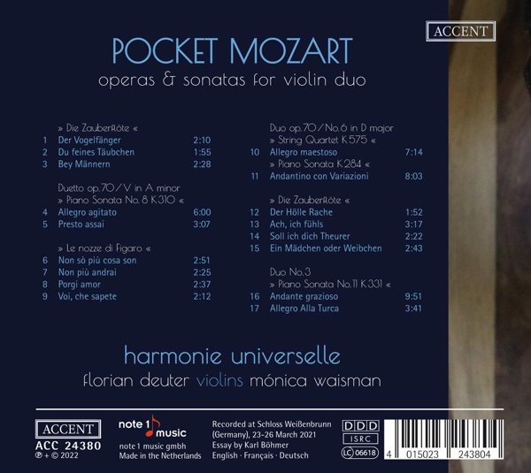 Beschreibung:While today it is easy to listen to almost any piece at any time and in almost any place, before the invention of the record it was quite complicated: you had to go to a concert or to the opera or you played yourself... In the emerging bourgeoisie, arrangements of the most popular works in instrumentations suitable for chamber music were popular and, of course, Mozart's famous operas were at the top of the popularity scale. In many places, publishers set about transcribing Mozart's works for small and very small ensembles. The two violinists Florian Deuter and Mónica Waisman have found a whole series of such contemporary arrangements of Mozart's operas and piano sonatas in "pocket format" for violin duo, which bring the well-known melodies into the new form with much wit and finesse. In the process, the listener can grin and observe the reduction of the full sound and delve into delightful details of house music around 1800., Runningtime: 00:00:00, Labelcode ACR24380.2