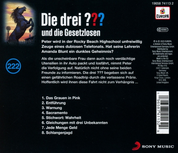 01. "222 - und die Gesetzlosen - 1. Das Grauen in Pink" 02. "222 - und die Gesetzlosen - 2. Entführung" 03. "222 - und die Gesetzlosen - 3. Warnung" 04. "222 - und die Gesetzlosen - 4. Sacramento" 05. "222 - und die Gesetzlosen - 5. Stichwort: Wahrheit" 06. "222 - und die Gesetzlosen - 6. Gleichungen mit drei Unbekannten" 07. "222 - und die Gesetzlosen - 7. Jede Menge Geld" 08. "222 - und die Gesetzlosen - 8. Schlangenjagd"