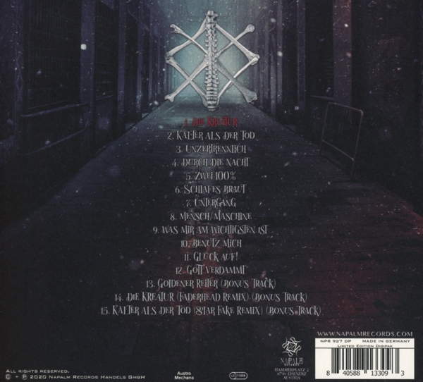 01. "DIE KREATUR" 02. "K?lter als der Tod" 03. "Unzertrennlich" 04. "Durch die Nacht" 05. "Zwei 100%" 06. "Schlafes Braut" 07. "Untergang" 08. "Mensch/Maschine" 09. "Was mir am wichtigsten ist" 10. "Benutz mich" 11. "Glück auf!" 12. "Gott verdammt" 13. "Goldener Reiter" 14. "DIE KREATUR (Faderhead Remix)" 15. "K?lter als der Tod (Solar Fake Remix)"