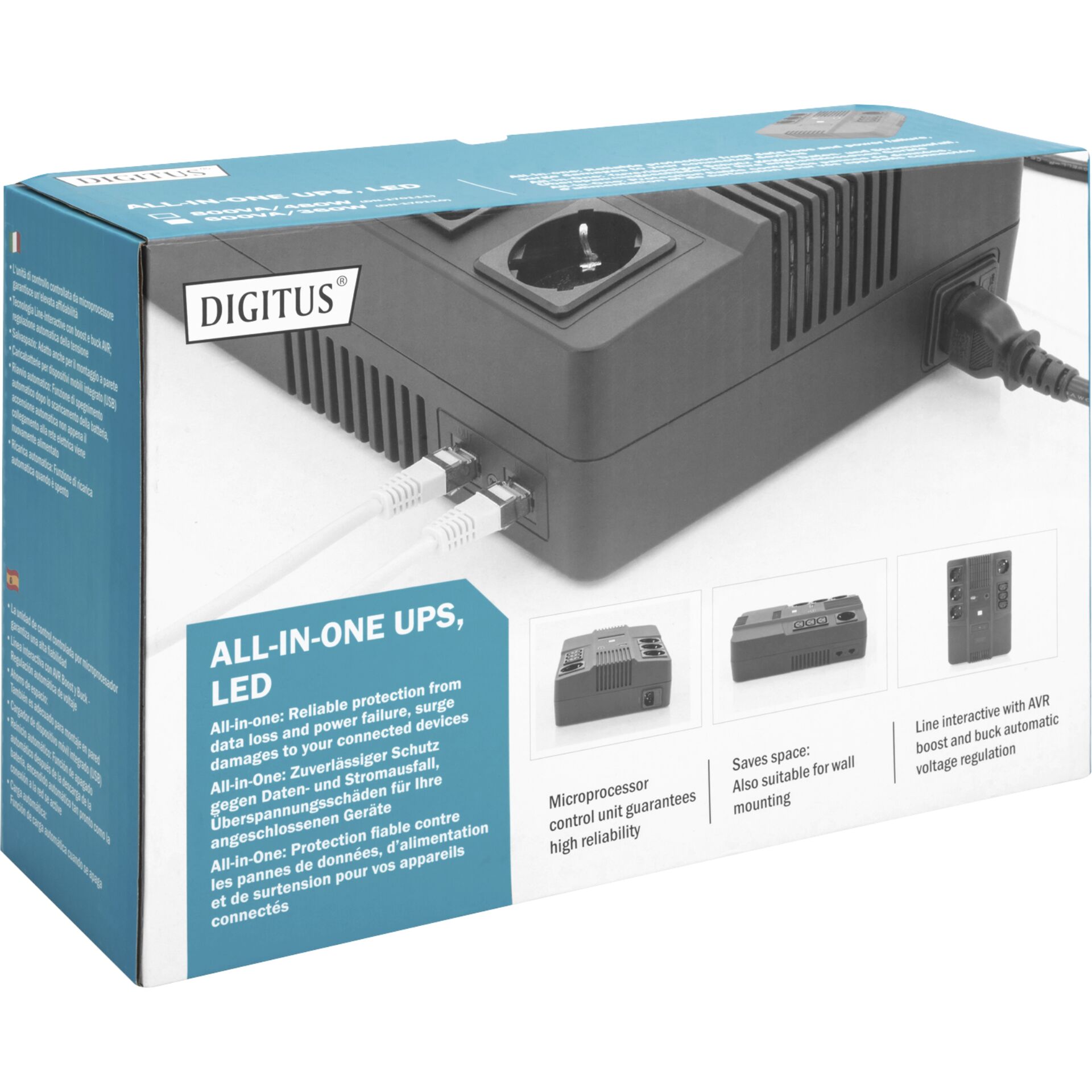 "All-in-One USV , 600VA/360W LED 12V/7Ah DN-170110" von Digitus Professional aus der Kategorie USVs&Zubehör besitzt folgende Design-form: Kompakt. Das Produkt ist mit 2 Ethernet-LAN-Anschluss /Anschlüssen ausgestattet. Das Gewicht beträgt 5,4 kg..