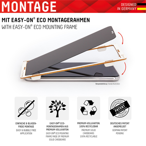 Beschreibung:PRIVACY Full Cover Real Glass mit EASY-ON® Eco-Montagerahmen Privacy Filter Dank dem speziellem Privacy-Filter, der in das Schutzglas integriert ist, wird das Display-Licht nur aus einem bestimmten Blickwinkel durchgelassen. Der integrierte Blickschutzfilter bewirkt, dass das Display-Licht nur bei frontalem Blick auf das Gerät ausgestrahlt wird. Ab einem seitlichen Betrachtungswinkel von 30 Grad bricht die Privacy Filter Protection das Licht, das Display erscheint schwarz. Dadurch bietet das Glas einen effektiven Schutz vor seitlichen Blicken von z.B. Sitznachbarn im Zug, Flugzeug oder Bus. Hinweis: aufgrund des Privacy Filters kann die Fingerprint-Funktion nicht unterstützt werden. Full Cover bzw. 3D/ Curved Schutzglas Im Vergleich zu sogenannten 2D Schutzgläsern decken die Displex Full Cover Panzergläser (3D/ Curved) nicht nur den aktiven, sondern den gesamten Displaybereich ab. Insbesondere bei gewölbten Displays empfehlen wir ein Full Cover Schutzglas (3D/ Curved), da es an die ?runden