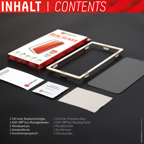 Der Sicherheitsglas-Displayschutz aus gehärtetem, echtem Glas bietet kristallklaren und extrem robusten Schutz vor Kratzern und Stößen. Natürlich glasklar und mit perfektem Touch!rnrn rnVollflächiger Displayschutz aus gehärtetem EchtglasrnKeine Kompromisse mehr! Der vollflächige Premium Displayschutz aus gehärtetem Echtglas mit hochwertig gefärbtem Glasrand bietet maximalen Schutz vor Kratzern und Stößen für die gesamte Oberseite!rnVollflächiges Echtglas mit farbigem Glasrand (Schwarz / Weiß)rnMaximaler Kratzerschutz mit 10H OberflächenhärternSchlag- und Aufprallschutz für das Displayrn100% exakte und einfache Aufbringung durch den Montagerahmen Easy-On® FramernFür Schutzhüllen geeignet - case-friendlyrnOptimale Transparenz in Ultra HD QualitätrnBeste Touch- & Scroll-Eigenschaften (3D- und Multi-Touch)rnPerfekt abgerundete Kanten für angenehmste HaptikrnAbsolut sicher dank Splitterschutz durch VerbundmaterialrnDesigned in Germanyrnrn Hauptmerkmale rn rn