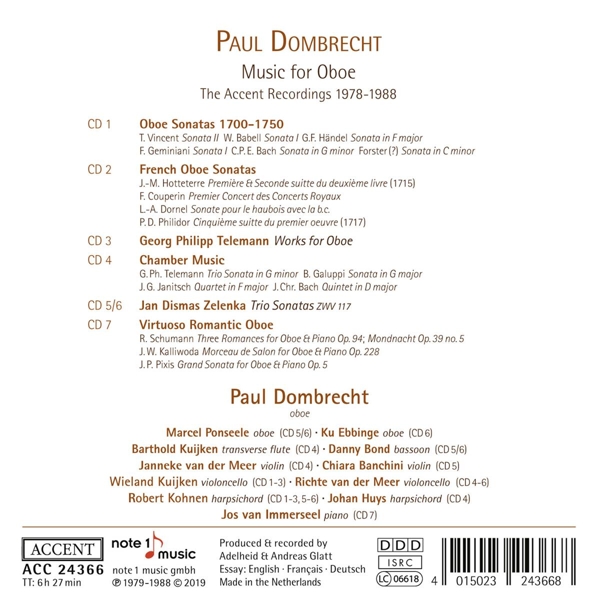 Disc 01 Sonate für Oboe und Basso continuo Nr. 2 A-Dur 01. Paul Dombrecht "1. Andante" 02. Paul Dombrecht "2. Allegro con spirito" 03. Paul Dombrecht "3. Adagio" 04. Paul Dombrecht "4. Allegro" Sonate für Oboe und Basso continuo Nr. 1 B-Dur 05. Paul Dombrecht "1. Adagio" 06. Paul Dombrecht "2. Vivace" 07. Paul Dombrecht "3. Adagio" 08. Paul Dombrecht "4. Allegro" Sonate für Oboe und Basso continuo Nr. 1 e-moll 09. Paul Dombrecht "1. Adagio" 10. Paul Dombrecht "2. Allegro" 11. Paul Dombrecht "3. Largo" 12. Paul Dombrecht "4. Vivace" Sonate für Oboe und Basso continuo F-Dur 13. Paul Dombrecht "1. Adagio" 14. Paul Dombrecht "2. Allegro" 15. Paul Dombrecht "3. Adagio" 16. Paul Dombrecht "4. Bourr?e anglaise" 17. Paul Dombrecht "5. Menuett" Sonate für Oboe und Basso continuo g-moll Wq 135 (H 549) 18. Paul Dombrecht "1. Adagio" 19. Paul Dombrecht "2. Allegro" 20. Paul Dombrecht "3. Vivace" Sonate für Oboe und Basso continuo c-moll 21. Paul Dombrecht "1. Adagio" 22. Paul Dombrecht "2. Allegro" 23. Paul Dombrecht "3. Adagio" 24. Paul Dombrecht "4. Gigue"
