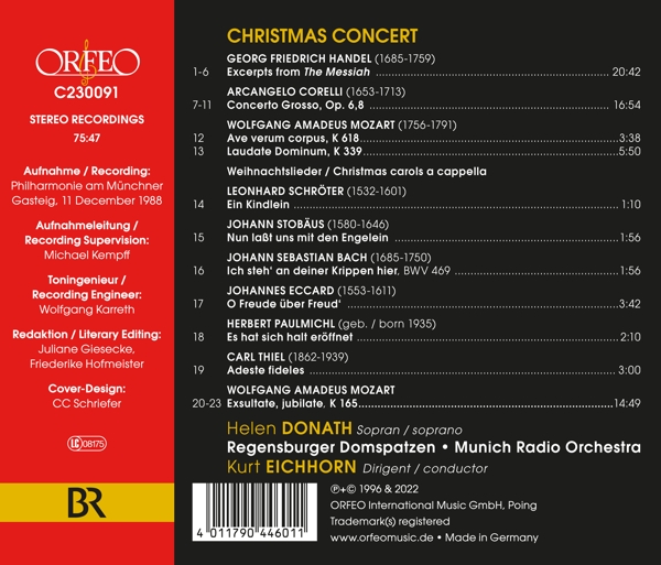 Der Messias HWV 56 (Oratorium) (Auszug) 01. Donath, Helen "Chor: Denn es ist uns ein Kind geboren" 02. Donath, Helen "Pastorale" 03. Donath, Helen "Rezitativ: Es waren die Hirten beisammen auf dem Felde" 04. Donath, Helen "Chor: Ehre sei Gott" 05. Donath, Helen "Arie: Erwache, frohlocke" 06. Donath, Helen "Chor: Halleluja" Concerto grosso g-moll op. 6 Nr. 8 "Fatto per la notte di Natale" (Weihnachtskonzert) 07. Eichhorn, Kurt "1. Vivace - Grave - Allegro" 08. Eichhorn, Kurt "2. Adagio - Allegro - Adagio" 09. Eichhorn, Kurt "3. Vivace" 10. Eichhorn, Kurt "4. Allegro" 11. Eichhorn, Kurt "5. Pastorale: Largo" 12. Donath, Helen "Ave verum corpus D-Dur KV 618 (Motette)" Vesperae solennes de confessore KV 339 (Auszug) 13. Donath, Helen "Laudate Dominum" 14. Donath, Helen "Ein Kindlein" 15. Donath, Helen "Nun lasst uns mit den Engelein" 16. Donath, Helen "Ich steh' an deiner Krippen hier" 17. Donath, Helen "O Freude über Freud" 18. Donath, Helen "Es hat sich halt er?ffnet" 19. Donath, Helen "Adeste fideles" Exsultate Jubilate KV 165 (158a) (Motette) 20. Donath, Helen "Exsultate, jubilate" 21. Donath, Helen "Fulget, amica dies" 22. Donath, Helen "Tu virginum corona" 23. Donath, Helen "Alleluja"