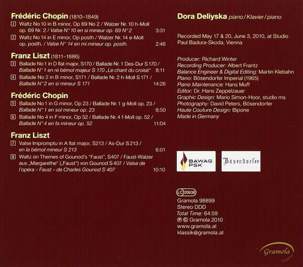 01. "Walzer Nr. 1-19 / für Klavier (auch Bearbeitung) Nr. 10 (op. ph. 69, 2 B 35 h-moll)" 02. "Walzer Nr. 1-19 / für Klavier (auch Bearbeitung) Nr. 14 (op. ph., 1 B 56 e-moll)" Balladen Nr. 1-2 (für Klavier) 03. "Nr. 1 Des-dur S 170" 04. "Nr. 2 h-moll S 171" 05. "Balladen Nr. 1-4 / für Klavier Nr. 1 (op. 23 g-moll)" 06. "Balladen Nr. 1-4 / für Klavier Nr. 4 (op. 52 f-moll)" 07. "Valse impromptu S 213 As-Dur (1842 / 52) (für Klavier)" 08. "Paraphr. / Paraphrasen (Fantasien) und Transkr. / für Klavier(e) nach verschied. Meistern (z.T. bearb.) S 407 (R 166 Fau"