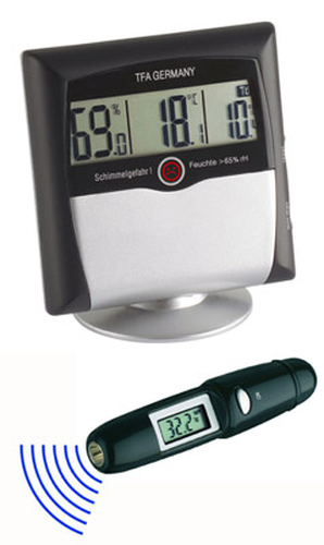 Beschreibung:zur Vermeidung von Schimmel im Wohnbereich bestehend aus 30.5011 "COMFORT CONTROL" Digitales Thermo-Hygrometer 31.1117 "EASYFLASH" Infrarot-Thermometer. Zur Kontrolle des Raumklimas und zum Aufspüren von Kältebrücken an Wänden, mit ausführlicher Gebrauchsanweisung und vielen Tipps zum aktiven Heizen und Lüften. Hauptmerkmale Funktionen Produktfarbe Schwarz Gewicht & Abmessungen Gewicht 275 g Weitere Spezifikationen Thermometer Ja Abmessungen (BxTxH) 94 x 66 x 102 mm