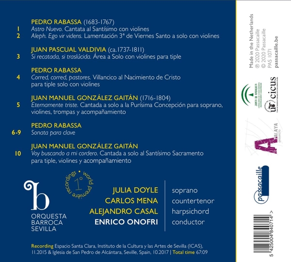 01. Julia Doyle "Astro Nuevo. Cantata al Sant¡simo con violines" 02. Carlos Mena "Aleph. Ego vir videns. Lamentaci¢n 3¦ de Viernes Santo a solo con violines" 03. Julia Doyle "Si recatada, si trasl£cida. Area a Solo con violines para tiple" 04. Julia Doyle "Corred, corred, pastores. Villancico al Nacimiento de Cristo para tiple solo con violines" 05. Julia Doyle "Eternamente triste. Cantada a solo a la Pur¡sima Concepci¢n para soprano, violines, trompas y acompanamiento" Sonata para clave 06. Alejandro Casal "Giusto" 07. Alejandro Casal "Allegro" 08. Alejandro Casal "Adagio" 09. Alejandro Casal "Allegro" 10. Julia Doyle "Voy buscando a mi cordero. Cantada a solo al Sant¡simo Sacramento para tiple, violines y acompanamiento"
