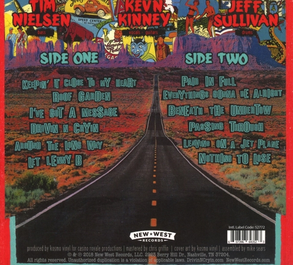 | | Beschreibung: | Comprised of Kevn Kinney on vocals/guitar and Tim Nielsen on bass/mandolin, along with Jeff Sullivan on drums, Drivin N Cryin's Kosmo Vinyl (The Clash, Sex Pistols, and more) produced (Casino Studio, Atlanta, GA) eponymous 1997 album had a short life on radio, with their cover of John Denver's "Leaving on a Jet Plane" getting some airplay in Alabama. Why this album went relatively unnoticed is a mystery. Maybe it was their return to their hometown, independent roots, after having left Geffen Records, that resulted in the album's release with little momentum. What we do know for certain is that Drivin N Cryin stayed true to their sound and who they were here. A little grit, a little roots. Now, 21 years later, the record has a title, new cover art (courtesy of Kosmo Vinyl himself), and momentum., Runningtime: 00:00:00, Bass: Tim Nielsen, Drums: Jeff Sullivan, Guitar, Lead Vocals: Kevn Kinney, Mastered By: Chris Griffin (2), Labelcode NEWW6435.2 (NW6435) |  | | Anzahl der Titel: |