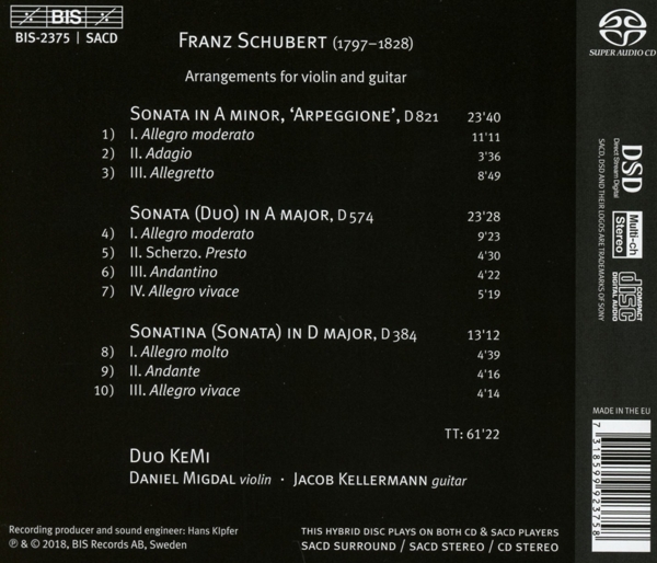 Sonate für Arpeggione und Klavier a-moll D 821 (bearb. für Gitarre und Klavier) 01. "1. Allegro moderato" 02. "2. Adagio" 03. "3. Allegretto" Duo A-Dur D 574 (Sonate für Violine und Klavier op. posth. 162) (bearb. für Gitarre und Klavier) 04. "1. Allegro moderato" 05. "2. Scherzo: Presto" 06. "3. Andantino" 07. "4. Allegro vivace" Sonatine für Violine und Klavier D-Dur op. 137 Nr. 1 D 384 (bearb. für Gitarre und Klavier) 08. "1. Allegro moderato" 09. "2. Andante" 10. "3. Allegro vivace"