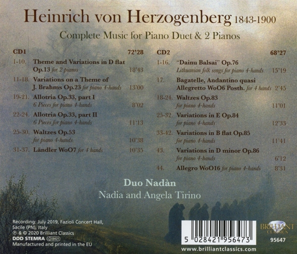 Disc 01 Thema und 9 Variationen für 2 Klaviere Des-Dur op.13 01. "1. Thema: Langsam, innig" 02. "2. Variation 1: Bewegter" 03. "3. Variation 2: In gleichem Tempo" 04. "4. Variation 3: Ziemlich langsam" 05. "5. Variation 4: Rasch" 06. "6. Variation 5: Sehr langsam" 07. "7. Variation 6: Etwas bewegt" 08. "8. Variation 7: Langsam" 09. "9. Variation 8: Sehr rasch" 10. "10. Variation 9: Majest?tisch" 7 Variationen über ein Thema von Johannes Brahms für Klavier zu 4 H?nden op. 23 11. "1. Thema: Andante" 12. "2. Variation 1: Adagio" 13. "3. Variation 2: Con moto" 14. "4. Variation 3: Allegro" 15. "5. Variation 4: Poco meno mosso, ma agitato" 16. "6. Variation 5: Allegretto" 17. "7. Variation 6: Lento, appassionato" 18. "8. Variation 7: Allegretto" Allotria op. 33 (6 Stücke für Klavier zu 4 H?nden) 19. "Nr. 1 Allegro" 20. "Nr. 2 Allegretto" 21. "Nr. 3 Allegro agitato" 22. "Nr. 4 Allegretto" 23. "Nr. 5 Andante maestoso" 24. "Nr. 6 Allegro commodo" Walzer für Klavier zu 4 H?nden op. 53 Nr. 1-6 25. "Nr. 1 Allegro commodo" 26. "Nr. 2 L'istesso tempo" 27. "Nr. 3 Agitato e grazioso" 28. "Nr. 4 Tempo I" 29. "Nr. 5 Poco maestoso" 30. "Nr. 6 L'istesso tempo" L?ndler für Klavier zu H?nden WoO 7 Nr. 1-7 31. "Nr. 1 Commodo" 32. "Nr. 2 L'istesso tempo" 33. "Nr. 3 Allegretto con moto" 34. "Nr. 4 Allegro" 35. "Nr. 5 Moderato espressivo" 36. "Nr. 6 Allegretto" 37. "Nr. 7 Allegro con fuoco"