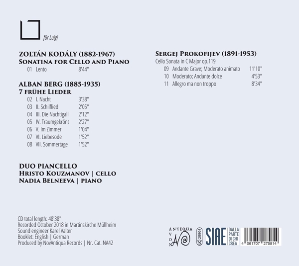 Beschreibung:Cello: Hristo Kouzmanov, Piano: Nadia Belneeva, Composed By: Zoltán Kodály, Composed By: Alban Berg, Composed By: Sergei Prokofiev, Labelcode NA42, Recorded At Martinskirche Müllheim, Baden