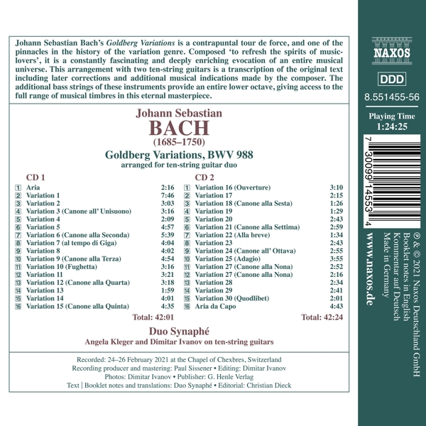 Disc 01 Goldberg-Variationen, Aria mit 30 Ver?nderungen (Clavierübung IV) BWV 988 (bearb. für 2 10-saitige Gitarren) 01. "1. Aria" 02. "2. Variation 1" 03. "3. Variation 2" 04. "4. Variation 3 (Canone all'Unisono)" 05. "5. Variation 4" 06. "6. Variation 5" 07. "7. Variation 6 (Canone alla Seconda)" 08. "8. Variation 7 (Al tempo di giga)" 09. "9. Variation 8" 10. "10. Variation 9 (Canone alla Terza)" 11. "11. Variation 10 (Fughetta)" 12. "12. Variation 11" 13. "13. Variation 12 (Canone alla Quarta)" 14. "14. Variation 13" 15. "15. Variation 14" 16. "16. Variation 15 (Canone alla Quinta)"