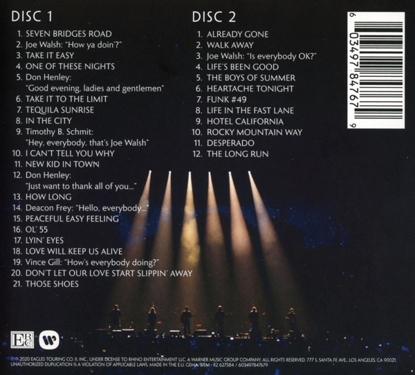 Disc 01 01. "Seven Bridges Road" 02. "Joe Walsh: "How ya doin'?"" 03. "Take It Easy" 04. "One Of These Nights" 05. "Don Henley: "Good evening, ladies and gentlemen"" 06. "Take it to the limit" 07. "Tequila Sunrise" 08. "In the city" 09. "Timothy B. Schmit: "Hey, everybody, that's Joe Walsh"" 10. "I Can't Tell You Why" 11. "New Kid In Town" 12. "Don Henley: "Just want to thank all of you..."" 13. "How Long" 14. "Deacon Frey: 'Hello, everybody...'" 15. "Peaceful easy feeling" 16. "Ol' 55" 17. "Lyin' Eyes" 18. "Love Will Keep Us Alive" 19. "Vince Gill: "How's everybody doing?"" 20. "Don't let our love start slippin' away" 21. "Those shoes"