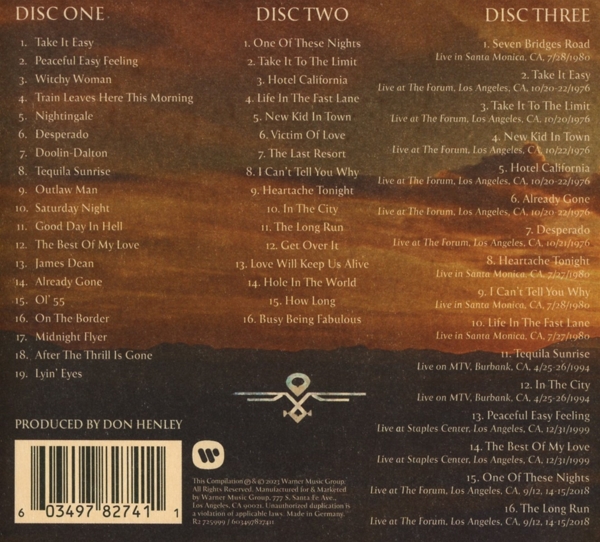 Disc 03 01. "Seven Bridges Road (Live In Santa Monica, CA, 7/28/1980)" 02. "Take It Easy (Live At The Los Angeles Forum October 20-22, 1976)" 03. "Take It To The Limit (Live At The Los Angeles Forum October 20-22, 1976)" 04. "New Kid In Town (Live At The Los Angeles Forum October 20-22, 1976)" 05. "Hotel California (Live At The Los Angeles Forum October 20-22, 1976)" 06. "Already Gone (Live At The Los Angeles Forum October 20-22, 1976)" 07. "Desperado (Live At The Los Angeles Forum October 20-22, 1976)" 08. "Heartache Tonight (Live In Santa Monica, CA, 7/27/1980)" 09. "I Can't Tell You Why (Live In Santa Monica, CA, 7/28/1980)" 10. "Life In The Fast Lane (Live In Santa Monica, CA, 7/27/1980)" 11. "Tequila Sunrise (Live On MTV, Burbank, CA, 4/25-26/1994)" 12. "In The City (Live On MTV, Burbank, CA, 4/25-26/1994)" 13. "Peaceful Easy Feeling (Live At Staples Center, Los Algeles, CA, 12/31/1999)" 14. "The Best Of My Love (Live At Staples Center, Los Algeles, CA, 12/31/1999)" 15. "One Of These Nights (Live At The Forum, Los Angeles, CA, 9/12, 14-15/2018)" 16. "The Long Run (Live At The Forum, Los Angeles, CA, 9/12, 14-15/2018)"