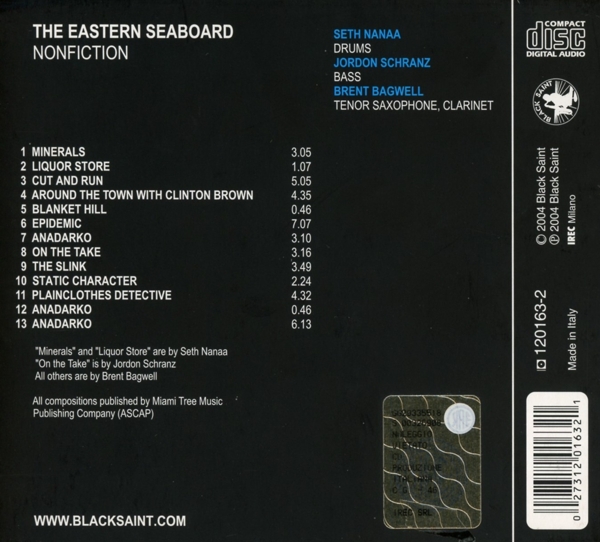 | Beschreibung: | Artwork [Cover Art]: Jordon Schranz, Bass: Jordon Schranz, Design: Maria Bonandrini, Drums: Seth Nanaa, Engineer: Ryan Blaine, Engineer, Mixed By: Chris Walldorf, Engineer, Mixed By: Jerry Teel, Executive-Producer: Flavio Bonandrini, Mastered By: Aldo Borrelli, Mixed By, Producer: Eastern Seaboard, Producer: Chris Walldorf, Tenor Saxophone, Clarinet: Brent Bagwell, Written By: Brent Bagwell, Written By: Jordon Schranz, Written By: Seth Nanaa, Labelcode CAM120163-2 (120163-2), Distributed By IREC Milano, Phonographic Copyright (p) Black Saint, Copyright (c) Black Saint, Recorded At Sioux Sioux Studios, Recorded At Funhouse Recording Studio, Mastered At Deluxe, Tribiano - Milano, Manufactured By Deluxe, Tribiano - Milano, Published By Miami Tree Music Publishing Company |