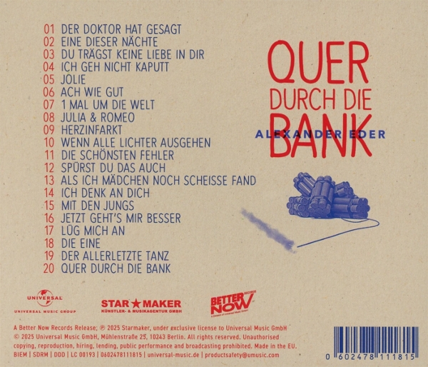 "Quer durch die Bank" ist das neueste CD-Album des österreichischen Singer-Songwriters Alexander Eder und erscheint beim Label Better Now Records. Das Album überzeugt mit Eders unverwechselbarem Mix aus Pop- und Rockelementen sowie seiner markanten Stimme und ehrlichen Texten ? ein musikalisches Erlebnis für Jung und Alt. Bekannt wurde Alexander Eder als Finalist bei "The Voice of Germany", wo er mit seinem tiefen Gesangstimbre begeisterte. Seitdem feiert er große Erfolge mit Songs wie "Lauf mich frei" und verzeichnet Millionen von Streams im Netz. Das Label Better Now Records steht für innovative Förderung aufstrebender Künstlerinnen und Künstler im deutschsprachigen Raum sowie höchste Produktionsqualität.