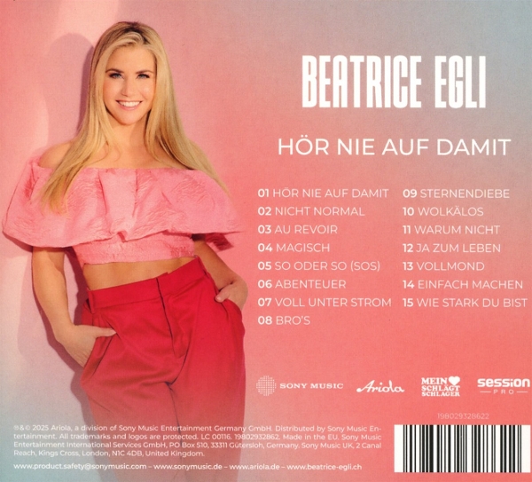 Mit "Hör nie auf damit - Deluxe Edition" präsentiert Beatrice Egli eine mitreißende und emotionale Sammlung von Songs, die ihre einzigartige Mischung aus Pop und Schlager eindrucksvoll zur Geltung bringen. Diese Deluxe-CD-Edition enthält neben den regulären Titeln auch exklusives Bonusmaterial und bietet Fans einen noch tieferen Einblick in Eglis musikalische Welt. Seit ihrem Sieg bei "Deutschland sucht den Superstar" im Jahr 2013 zählt Beatrice Egli zu den erfolgreichsten Schweizer Künstlerinnen im deutschsprachigen Raum. Ihre energiegeladenen Auftritte und gefühlvollen Texte wurden mehrfach mit Gold- und Platin-Auszeichnungen sowie einer treuen Fangemeinde europaweit belohnt. Das Album erscheint beim renommierten Label Ariola Local, das für hochwertige Produktionen im Bereich Pop und Schlager bekannt ist und zahlreiche Top-Künstler Europas unterstützt.