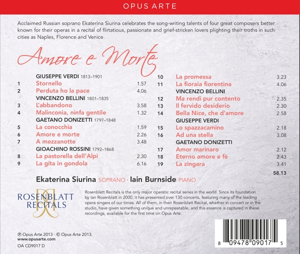 | Beschreibung: | Design [Package]: Georgina Curtis, Executive-Producer: Ben Pateman, Executive-Producer: Ian Rosenblatt, Liner Notes [Translation]: Barbara Miller (9), Liner Notes [Translation]: Camilla Toldi Bugge, Liner Notes [Translation]: Kate Singleton, Liner Notes [Translation]: Leandra Rhoese, Liner Notes [Translation]: Noémie Gatzler, Liner Notes [Translation]: Paulo V. Montanari, Photography By: David Elofer, Piano, Music Consultant: Iain Burnside, Producer [Recording], Engineer: Simon Kiln, Soprano Vocals: Ekaterina Siurina, Composed By: Giuseppe Verdi, Composed By: Giuseppe Verdi, Composed By: Vincenzo Bellini, Composed By: Vincenzo Bellini, Composed By: Gaetano Donizetti, Composed By: Gaetano Donizetti, Composed By: Gaetano Donizetti, Composed By: Gioacchino Rossini, Composed By: Gioacchino Rossini, Composed By: Gioacchino Rossini, Composed By: Gioacchino Rossini, Composed By: Vincenzo Bellini, Composed By: Vincenzo Bellini, Composed By: Vincenzo Bellini, Composed By: Giuseppe Verdi, Composed By: Giuseppe Verdi, Composed By: Gaetano Donizetti, Composed By: Gaetano Donizetti, Composed By: Gaetano Donizetti, Labelcode BOPU9017.2 (OA CD9017 D), Phonographic Copyright (p) Opus Arte, Copyright (c) Opus Arte, Recorded At St. Paul's Church, New Southgate, London |