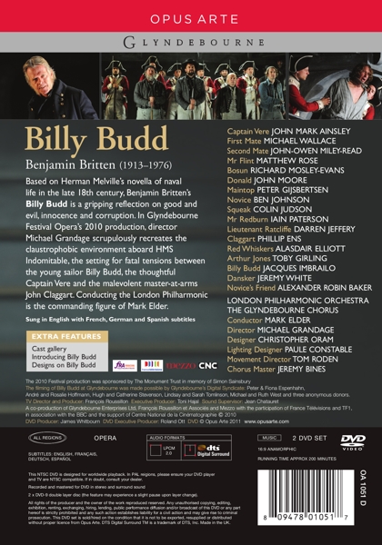 | | Beschreibung: | John Mark Ainsley, Jacques Imbrailo, Phillip Ens, Iain Paterson, Matthew Rose, Darren Jeffery, Alasdair Elliott, John Moore, Jeremy White, Ben Johnson, Colin Judson, and Richard Mosley-Evans star in this Glyndebourne production of this Britten opera., Runningtime: 00:00:00, Chorus: Glyndebourne Festival Chorus, Chorus Master: Jeremy Bines, Composed By: Benjamin Britten, Directed By [Movement Director]: Tom Roden, Directed By [Staged]: Michael Grandage, Executive-Producer [DVD]: Roland Ott, Executive-Producer [TV]: Jean Chatauret, Film Director [TV], Producer [TV]: François Roussillon, Leader [Orchestra]: Pieter Schoeman, Libretto By: E. M. Forster, Libretto By: Eric Crozier (2), Libretto By [Adapted From]: Herman Melville, Lighting [Designer]: Paule Constable, Liner Notes: Peter Reed, Liner Notes [French Translation]: Dennis Collins (2), Liner Notes [German Translation]: Eckhardt Van Den Hoogen, Orchestra: London Philharmonic Orchestra, Photography By: Alastair Muir, Producer [DVD]: James Whitbourn, Producer [DVD]: Lauretta Horrocks, Set Designer: Christopher Oram, Text By [Subtitles]: ECI, Vocals [Arthur Jones]: Toby Girling, Vocals [Billy Budd]: Jacques Imbrailo, Vocals [Bosun]: Richard Mosley-Evans, Vocals [Cabin Boy]: Sam Honywood, Vocals [Captain Vere]: John Mark Ainsley, Vocals [Claggart]: Phillip Ens, Vocals [Dansker]: Jeremy White, Vocals [Donald]: John Moore (41), Vocals [First Mate]: Michael Wallace (6), Vocals [Lieutenant Ratcliffe]: Darren Jeffery, Vocals [Maintop]: Peter Gijsbertsen, Vocals [Mr Fint]: Matthew Rose (3), Vocals [Mr Redburn]: Iain Paterson, Vocals [Novice's friend]: Alexander Robin Baker, Vocals [Novice]: Ben Johnson (31), Vocals [Red Whiskers]: Alasdair Elliott, Vocals [Second Mate]: John-Owen Miley-Read, Vocals [Squeak]: Colin Judson, Labelcode BOPU1051DVD (OA 1051 D), Copyright (c) Opus Arte, Copyright (c) Glyndebourne Enterprises Ltd., Copyright (c) François Roussillon Et Associés, Copyright (c) Mezzo TV, Recorded At Glyndebourne Festival Opera House, Engineered At EPC (4), Glass Mastered At Technicolor, Glass Mastered At Technicolor, Glass Mastered At Technicolor, Lacquer Cut At Technicolor |  | | Darsteller: |