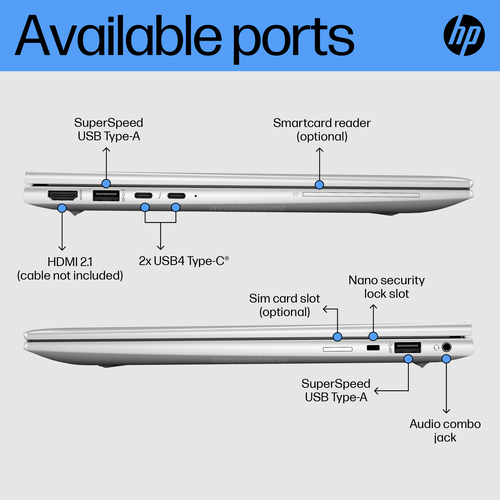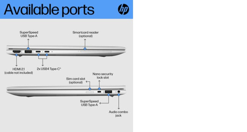 Bildschirm | Farbskala | 100 % | RGB-Farbraum | sRGB | Bildschirmdiagonale in cm | 33,8 cm | Helligkeit | 400 cd/m² | Blendfreier Bildschirm | Ja | Natives Seitenverhältnis | 16:10 | Panel-Typ | IPS | HD-Typ | WUXGA | Touchscreen | Nein | Display-Auflösung | 1920 x 1200 Pixel | Bildschirmdiagonale | 33,8 cm | Prozessor(en) | Prozessor Cache Typ | L3 | Prozessor-Cache | 16 MB | Prozessor Boost-Frequenz | 4,9 GHz | Prozessor-Threads | 12 | Anzahl Prozessorkerne | 6 | Prozessorgeneration | AMD Ryzen 7000 Series | Prozessor-Taktfrequenz | 3,2 GHz | Prozessor(en) | 7540U | Prozessorhersteller | AMD | Prozessorfamilie | AMD Ryzen™ 5 | Anschlüsse und Schnittstellen | USB-Typ-C DisplayPort-Wechselmodus | Ja | Kombinierter Kopfhörer-/Mikrofon-Anschluss | Ja | Anzahl Thunderbolt 4-Ports | 2 | HDMI-Version | 2.1 | Anzahl HDMI-Anschlüsse | 1 | USB 3.2 Gen 1 (3.1 Gen 1) Anzahl der Anschlüsse vom Typ C | 0 | USB 3.2 Gen 1 (3.1 Gen 1) Anzahl der Anschlüsse vom Typ A | 2 | Anzahl USB 2.0 Anschlüsse | 0 | Speicher | Ohne ECC | Ja | ECC | Nein | Memory Formfaktor | On-board | Speichertaktfrequenz | 6400 MHz | Interner Speichertyp | LPDDR5-SDRAM | RAM-Speicher maximal | 16 GB | Speicherkapazität | 16 GB | Gewicht und Abmessungen | Höhe | 19,2 mm | Tiefe | 214,8 mm | Breite | 300,1 mm | Gewicht | 1,27 kg | Energie | USB Power Delivery | Ja | Netzteil Eingansgsspannung | 100 - 240 V | Netzteilfrequenz | 50 - 60 Hz | Netzteilstärke | 65 W | USB Typ-C Ladeport | Ja | Audio | Mikrofonanzahl | 2 | Eingebautes Mikrofon | Ja | Lautsprecher Hersteller | Bang & Olufsen | Anzahl eingebauter Lautsprecher | 2 | Eingebaute Lautsprecher | Ja | Audio-System | B&O PLAY | Tastatur | Eingabegerätetyp | HP Premium Tastatur | Spritzwassergeschützte Tastatur | Ja | Tastatur mit Hintergrundbeleuchtung | Ja | Eingabegerät | Clickpad | Numerisches Keypad | Nein | Netzwerk | Bluetooth-Version | 5.3 | Bluetooth | Ja | Hersteller von WLAN-Controllern | Realtek | WLAN-Controllermodell | Realtek RTL8852CE | Antennentyp | 2x2 | WLAN-Standards | Wi-Fi 6E (802.11ax) | Top WLAN-Standard | Wi-Fi 6E (802.11ax) | Mobile Netzwerkverbindung | Nein | Sicherheit | Passwortschutz-Art | BIOS, Einschalten, Benutzer | Passwortschutz | Ja | Trusted Platform Module (TPM) Version | 2.0 | Trusted Platform Module (TPM) | Ja | Fingerabdruckscanner | Ja | Zertifikate | Konformitätsbescheinigungen | CCC, GS mark | Software | vorinstallierte Software | HP Connection Optimizer; HP Hotkey Support; HP Support Assistant; HP Easy Clean; HP Power Manager; myHP; HP Privacy Settings; HP Notifications; HP PC Hardware Diagnostics Windows; HP Services Scan; HP Smart Support (Download) | Installiertes Betriebssystem | Windows 11 Pro | Kamera | Infrarot (IR)-Kamera | Ja | Front Kamera | Ja | Speichermedium | NVMe | Ja | SSD Schnittstelle | PCI Express | SSD Speicherkapazität | 512 GB | Anzahl SSD installiert | 1 | Gesamtkapazität der SSDs | 512 GB | Optisches Laufwerk - Typ | Nein | Speichermedien | SSD | Gesamtspeicherkapazität | 512 GB | Verpackungsdaten | Verpackungshöhe | 305 mm | Verpackungstiefe | 483 mm | Verpackungsbreite | 69 mm | Sonstige Funktionen | Anzahl der Lautsprecher | 2 | Akku/Batterie | Anzahl Batteriezellen | 3 | Akku-/Batterietechnologie | Lithium-Ion (Li-Ion) | Batteriekapazität | 51 Wh | Grafik | On-Board-Grafikadapterfamilie | AMD Radeon Graphics | Hersteller der eingebauten GPU | AMD | Eingebautes Grafikkartenmodell | AMD Radeon Graphics | Separates Grafikkartenmodell | Nicht verfügbar | Separater Grafikadapter | Nein | Eingebaute Grafikadapter | Ja | Design | Ursprünglicher Markenname | HP | Marktpositionierung | Premium | Formfaktor | Klappgehäuse | Produktfarbe | Silber | Produkttyp | Laptop | Markeneigenschaften | HP GTIN (EAN/UPC) | 197497476699 | HP-Segment | Business | HP Management-Tools | HP Client Management Script Library (Download); HP Driver Packs (Download); HP Client Catalog (Download); HP Manageability Integration Kit Gen4 (Download); HP Image Assistant Gen5 (Download); HP Patch Assistant (Download); HP Cloud Recovery; HP Connect für Microsoft Endpoint Manager | HP Security-Tools | Absolute Persistence Module; HP Secure Erase; HP Sure Click; HP Sure Recover; HP Sure Run; HP Sure Sense; BIOS-Update über das Netzwerk; HP Sure Admin; HP BIOSphere Gen6; TPM 2.0 Embedded Security Chip (zertifiziert nach Common Criteria EAL4+ und FIPS 140-2 Level 2); HP Sure Start Gen7; HP Wake on WLAN; HP Tamper Lock; Secured-Core PC-fähig | HP Support-Assistent | Ja | HP Verbindungsoptimierer | Ja | Lieferumfang | Eingabestift | Nein | Logistikdaten | Warentarifnummer (HS) | 84713000000 | Nachhaltigkeit | Nachhaltigkeitskonformität | Ja | Nachhaltigkeitszertifikate | ENERGY STAR, TCO | CO2-Fußabdruck | Kohlenstoffemissionen gesamt, mit/ohne Nutzungsphase(kg an CO2e) | 33 | Kohlenstoffemissionen, Logistik (kg an CO2e) | 4 | Kohlenstoffemissionen, Herstellung (kg an CO2e) | 175 | Gesamter Kohlendioxid-Fußabdruck (kg of CO2e) | 210 |