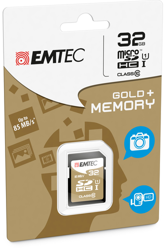 EMTEC Gold+ - Flash-Speicherkarte - 32 GB - Class 10 - SDHC Gruppe Flash-Speicher Hersteller EMTEC Hersteller Art. Nr. ECMSD32GHC10GP Modell Gold+ EAN/UPC Produktbeschreibung: EMTEC Gold+ - Flash-Speicherkarte - 32 GB - SDHC Produkttyp Flash-Speicherkarte Formfaktor SDHC-Speicherkarte Speicherkapazität 32 GB Geschwindigkeit Class 10