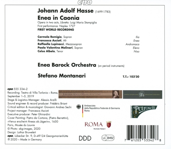 Disc 01 Enea in Caonia (Serenata) (Gesamtaufnahme) 01. "Sinfonia" 02. "Rezitativ: Navi straniere in porto? (1. Teil)" 03. "Arie: Se, qual tu sei, qui son s belle" 04. "Rezitativ: Signor, non ho nel volto" 05. "Arie: Ninfa sei, che al bosco, e al monte" 06. "Rezitativ: Perdonami, non dei" 07. "Arie: Pur s'? placata" 08. "Rezitativ: Ilia, co' i miei seguaci" 09. "Arie: Spargo rami di fiori, e di mirti" 10. "Rezitativ: Andromaca! - Ahi! Che vedo?" 11. "Arie: Ti bacio, t'abbraccio" 12. "Rezitativ: Umile a voi m'inchino" 13. "Arie: E vero, che son povera"