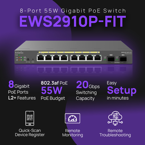 Der EnGenius-Fit Layer2+ Switch, EWS2910P-FIT, bietet eine kostengünstige Lösung mit 8 Gigabit-PoE-Ports, 2 Gigabit-SFP-Uplink-Ports und einem 55-W-Budget. Er unterstützt Zero-Touch-Provisioning, zentralisiertes Cloud-Management und bietet EnGenius FitXpress (Cloud-verwaltet), FitController (vor Ort) oder Standalone-Management-Optionen. Mit fortschrittlichen Sicherheitsfunktionen und Voice-VLAN ist es für die Netzwerkeffizienz optimiert und ideal für KMUs.
