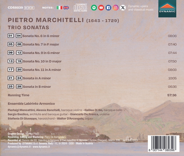 Beschreibung:There was a remarkable outpouring of Italian instrumental music from the 17th century onwards yet many composers who contributed to this flourishing body of work remain relatively unknown. One such composer is Pietro Marchitelli who was born around 1643 and was active in Naples as an outstanding violinist. Some 30 sonatas survive in a small number of collections. The seven lively and tuneful sonatas on this album conform to the precedent established by Corelli and are played by Labirinto Armonico, an ensemble that has collaborated with some of the very best early music performers., Runningtime: 00:00:00, Labelcode DNMC8039.2
