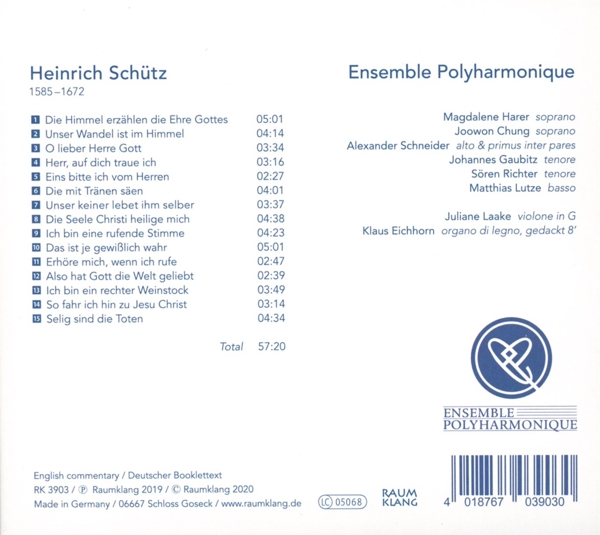 | Beschreibung: | Runningtime: 00:00:00, Alto Vocals, Directed By: Alexander Schneider (2), Bass Vocals: Matthias Lutze, Composed By: Heinrich Schütz, Ensemble: Ensemble Polyharmonique, Organ [Organo di legno]: Klaus Eichhorn, Producer: Ensemble Polyharmonique, Producer: Sebastian Pank, Soprano Vocals: Joowon Chung, Soprano Vocals: Magdalene Harer, Tenor Vocals: Johannes Gaubitz, Tenor Vocals: Sören Richter, Violone: Juliane Laake, Labelcode RK 3903, Phonographic Copyright (p) Raumklang, Copyright (c) Raumklang, Manufactured By www.discpartner.de |