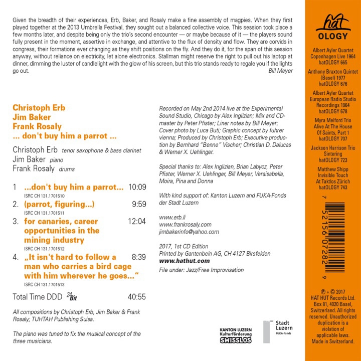 Beschreibung:Runningtime: 00:00:00, Composed By [All Compositions By]: Christoph Erb, Composed By [All Compositions By]: Frank Rosaly, Composed By [All Compositions By]: Jim Baker, Design Concept [Graphic Concept]: fuhrer vienna, Drums: Frank Rosaly, Executive-Producer: Bernhard Vischer, Executive-Producer: Christian Dalucas, Executive-Producer: Werner X. Uehlinger, Liner Notes: Bill Meyer (2), Mixed By, Mastered By: Peter Pfister, Photography By [Cover Photo]: Luca Buti, Piano: Jim Baker, Producer [Produced By]: Christoph Erb, Recorded By: Alex Inglizian, Tenor Saxophone, Bass Clarinet: Christoph Erb, Labelcode HAHT728.2 (hatOLOGY 728), Copyright (c) Hat Hut Records Ltd., Phonographic Copyright (p) Hat Hut Records Ltd., Recorded At Experimental Sound Studio, Manufactured By www.adon.ch, Printed By Gantenbein AG, Published By Tuhtah Publishing