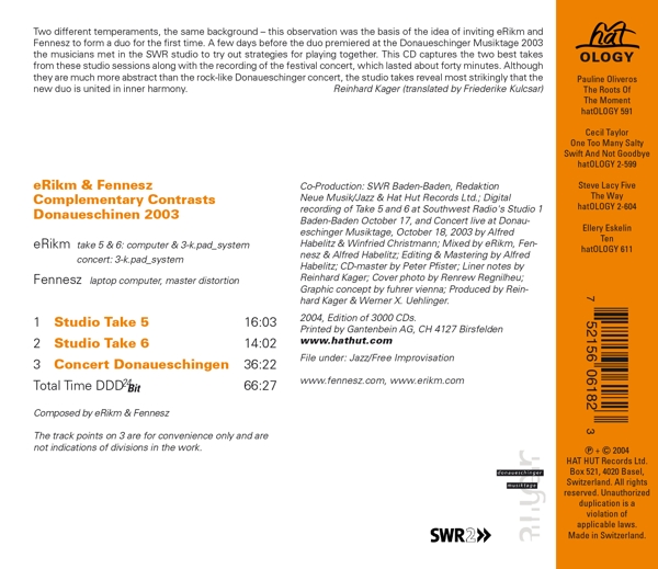 Beschreibung:Runningtime: 00:00:00, Co-producer: SWR2 Redaktion Neue Musik/Jazz, Composed By: Fennesz, Composed By: eRikm, Computer: eRikm, Computer [Laptop], Effects [Master Distortion]: Fennesz, Design Concept [Graphic Concept]: fuhrer vienna, Edited By, Mastered By: Alfred Habelitz, Electronics [3-k Pad System]: eRikm, Liner Notes: Reinhard Kager, Liner Notes [Translated By]: Friederike Kulcsar, Mastered By [CD-master By]: Peter Pfister, Mixed By: Alfred Habelitz, Mixed By: Fennesz, Mixed By: eRikm, Photography By [Cover Photo By]: Renrew Regnilheu, Producer: Reinhard Kager, Producer: Werner X. Uehlinger, Recorded By [Digital Recording By]: Alfred Habelitz, Recorded By [Digital Recording By]: Winfried Christmann, Labelcode HAHT618.2 (hatOLOGY 618), Manufactured By SDC (3), Phonographic Copyright (p) Hat Hut Records Ltd., Copyright (c) Hat Hut Records Ltd., Printed By Gantenbein AG, Recorded At SWR Studio 1, Baden-Baden
