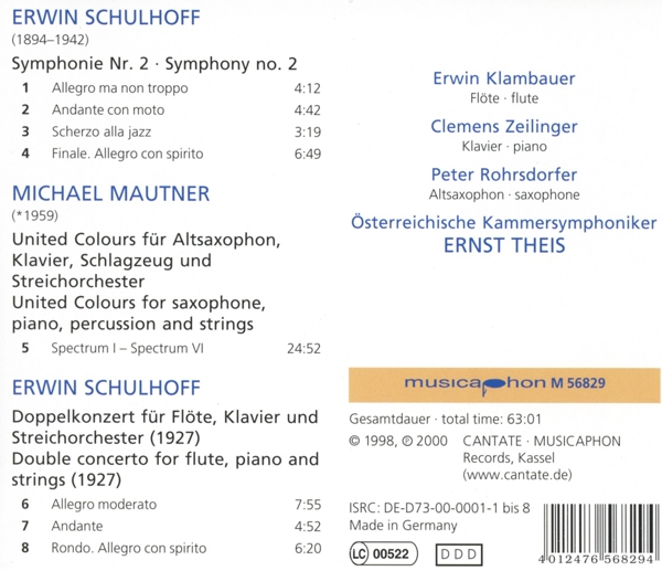 Sinfonie Nr. 2 01. Theis, Ernst "1. Allegro ma non troppo" 02. Theis, Ernst "2. Andante con moto" 03. Theis, Ernst "3. Scherzo alla jazz" 04. Theis, Ernst "4. Finale: Allegro con spirito" 05. Rohrsdorfer, Peter "United Colours (für Altsaxophon, Klavier, Schlagzeug und Streichorchester)" Doppelkonzert für Fl?te, Klavier und Streichorchester (1927) 06. Klambauer, Erwin "1. Allegro moderato" 07. Klambauer, Erwin "2. Andante" 08. Klambauer, Erwin "3. Rondo: Allegro con spirito"