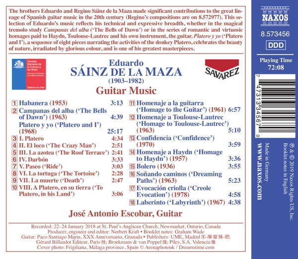Beschreibung:The brothers Eduardo and Regino Sainz de la Maza made significant contributions to the great lineage of Spanish guitar music in the 20th century. This selection of Eduardo's music reflects his technical and expressive breadth, whether in the magical tremolo study Campanas del alba ('The Bells of Dawn') or in the series of romantic and virtuosic homages paid to Haydn, Toulouse- Lautrec and his own instrument, the guitar. Platero y yo (Platero and I), a sequence of eight pieces narrating the activities of the donkey Platero, celebrates the beauty of nature, irradiated by glorious color, and is one of his greatest masterpieces., Runningtime: 00:00:00, Labelcode NXS8573456.2