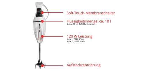 "Esge M 100 D Design" von Unold aus der Kategorie Küchengeräte wiegt 422 g und besitzt die Abmasse (BxTxH) 69 x 69 x 350 mm. Es handelt sich bei dem Produkt um eine (n) Pürierstab und hat die Farbe Weiß.
