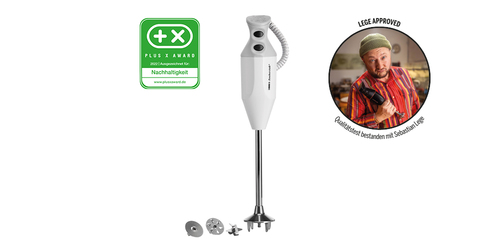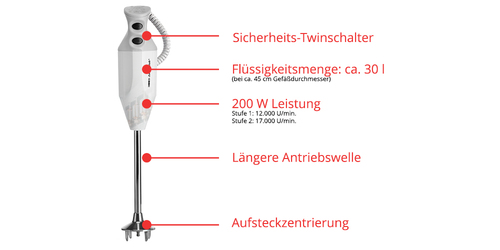 ESGE-Zauberstab P 200 Profi Nicht nur in Privathaushalten ist der ESGE-Zauberstab seit Jahrzehnten ein ebenso bewährter wie beliebter Küchenpartner - auch Profiköche setzen seine Power mit Begeisterung ein, denn der robuste und langlebige AC-Motor ?Made in Switzerland? ist den harten Anforderungen des Gastronomiealltags problemlos gewachsen! Der ESGE-Zauberstab G 200 Gastro ist maßgeschneidert für die Bedürfnisse der Profiköche, denn durch die längere Antriebswelle für eine Eintauchtiefe bis circa 29 Zentimetern können mit ihm bis zu 20 Liter Flüssigkeit in einem Arbeitsgang verarbeitet werden - zum Beispiel zu cremigen Suppen oder luftigen Desserts. Zur Ausstattung des mitsamt praktischem Wandhalter gelieferten ESGE-Zauberstab G 200 Gastro gehören das Multimesser, die Schlagscheibe und die Quirlscheibe. Durch die Aufsteckzentrierung lassen sich die Zubehörteile ganz bequem und schnell aufstecken. Das 200 Watt starke Powerpaket mit dem Sicherheits-Twinschalter schafft wahlweise 12.000 oder
