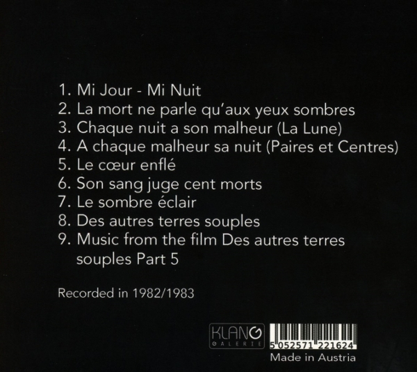 1: Mi Jour - Mi Nuit (7:01) 2: La Mort Ne Parle Qu'aux Yeux Sombres (13:06) 3: Chaque Nuit A Son Malheur (La Lune) (7:56) 4: A Chaque Malheur Sa Nuit (Paires Et Centres) (2:28) 5: Le C?ur Enflé (15:36) 6: Son Sang Juge Cent Morts (6:00) 7: Le Sombre Éclair (6:18) 8: Des Autres Terres Souples (2:49) 9: Music From The Film Des Autres Terres Souples Part 5 (9:46)