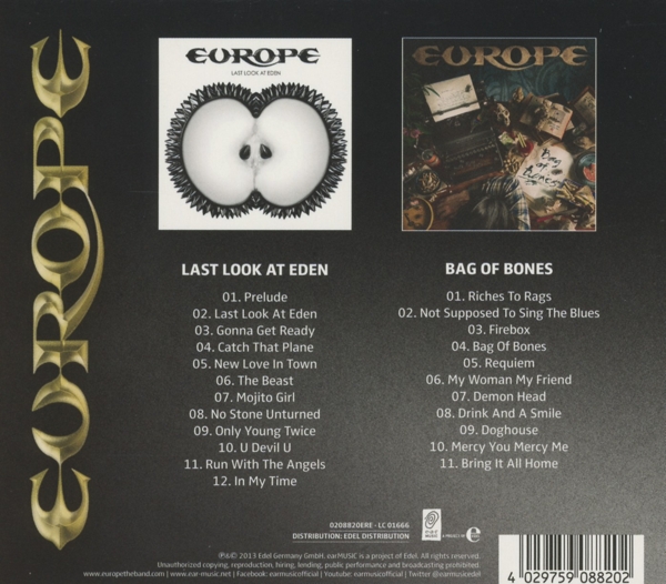 Beschreibung:UK two CD set containing a pair of recent albums from the Swedish AOR/melodic Hard Rock band. Last Look at Eden (2009) not only hit #1 in the band's home country of Sweden but also celebrated huge chart success all over the world. From the epic title track, to the melodic ballad 'New Love in Town', the album level is always on the top range. It's successor, Bag of Bones, was the band's ninth studio album. With it's typically strong melodies and the tangible joy of playing, this is a straight forward rock album, which range still reaches astonishing dimensions - even for Europe: The experienced five-piece managed to develop further and break limits once again, without selling their 'hard rock soul'., Labelcode UNUK5908820.2