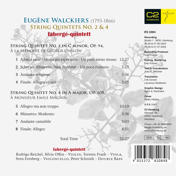 Beschreibung:They've done it again! The fabergé quintet excels in the ravishing premiere recordings of the String Quintets Nos. 2 and 4 by the almost forgotten French composer Eugène Walckiers (1793-1866). Following their highly acclaimed and award-winning recordings of the string quintets by Adolphe Blanc, the piano quintets by Ralph Vaughan Williams and Hermann Goetz, and the album "Gran Sestetto" featuring Russian piano sextets, the ensemble has now recorded with it's fourth release featuring late works by a composer who lived in Paris in the 19th century during a time of upheaval and new beginnings. Composed in the 1850s, these works for classical string quartet with double bass are gems of chamber music and will continue to delight audiences today with their classical beauty and dazzling wealth of ideas! The period of the middle of the 19th century, when many things were in a state of political and social upheaval in Paris, was also marked by rich artistic, literary and compositional creativity. A new cityscape emerged at an alarming pace; the small winding streets disappeared in favor of wide boulevards and open squares. Some - like the writer Georges Sand - rapturously praised the change; others mourned it as a loss of what they had come to love and trust. It was precisely in these years of upheaval that Eugène Walckier's string quintets were written., Runningtime: 00:00:00, Labelcode ESDU2084.2