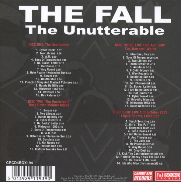 "The Unutterable (Expanded 4CD Edition)" ist eine umfassende Neuauflage des gefeierten Albums von 2000 der Band The Fall ? einer der einflussreichsten und langlebigsten Gruppen des Post-Punk-Genres. Diese Deluxe-Ausgabe vom renommierten Label Cherry Red enthält das original Album als Remaster sowie drei zusätzliche CDs mit seltenen Tracks, Live-Aufnahmen und bisher unveröffentlichtem Material ? ein Muss für Fans und Sammler gleichermaßen! Gegründet wurde The Fall 1976 in Manchester; die Band um den charismatischen Mark E. Smith prägte mit ihrem kompromisslosen Sound aus kantigen Gitarrenriffs und bissigen Texten Generationen von Musikern weltweit. Mit über dreißig Studioalben steht die Gruppe wie kaum eine andere für Innovation im Alternative-Bereich. Das britische Label Cherry Red hat sich einen Namen gemacht durch liebevoll gestaltete Wiederveröffentlichungen musikalischer Klassiker ? stets hochwertig produziert für Kenner und Neueinsteiger.