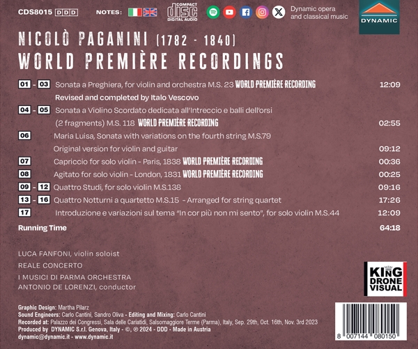 Sonata a Preghiera (für Violine und Orchester) M.S. 23 (rev. und vervollst. von Italo Vescovo) 01. Fanfoni, Luca "1. Introduktion" 02. Fanfoni, Luca "2. Recitativo - Moderato - Allegro - Preghiera" 03. Fanfoni, Luca "3. Thema mit Variationen - Variation 1 - Variation 2 (minore) - Variation 3 - Finale - Allegro" Sonate für skordierte Violine (2 Fragmente) M.S. 118 04. Fanfoni, Luca "1. Allegro spiritoso" 05. Fanfoni, Luca "2. (ohne Satzbezeichnung)" Sonate mit Variationen auf der 4. Saite "Maria Luisa" M.S. 79 (für Violine und Gitarre) 06. Fanfoni, Luca "1. Introduktion - Tempo di Minuetto - Adagio - Polonese variata - Andantino - Variation 1 - Variation 2 (minore) - ..." 07. Fanfoni, Luca "Capriccio für Violine solo" 08. Fanfoni, Luca "Agitato für Violine solo" 4 Etüden für Violine solo M.S. 138 09. Fanfoni, Luca "Nr. 1 Sostenuto" 10. Fanfoni, Luca "Nr. 2 Moderato" 11. Fanfoni, Luca "Nr. 3 Moderato assai" 12. Fanfoni, Luca "Nr. 4 Sostenuto" Quattro Notturni a quartetto M.S. 15 (bearb. für Streichquartett) 13. Reale Concerto Ensemble "Nr. 1 Adagio - Allegretto" 14. Reale Concerto Ensemble "Nr. 2 Adagio - Polonese - Andante" 15. Reale Concerto Ensemble "Nr. 3 Andante Cantabile - Andantino Tempo di Valzer" 16. Reale Concerto Ensemble "Nr. 4 Introduktion - Largo - Andante brillante" 17. Fanfoni, Luca "Introduktion und Variationen über das Thema In cor pi? non mi sento (für Violine solo) M.S. 44"