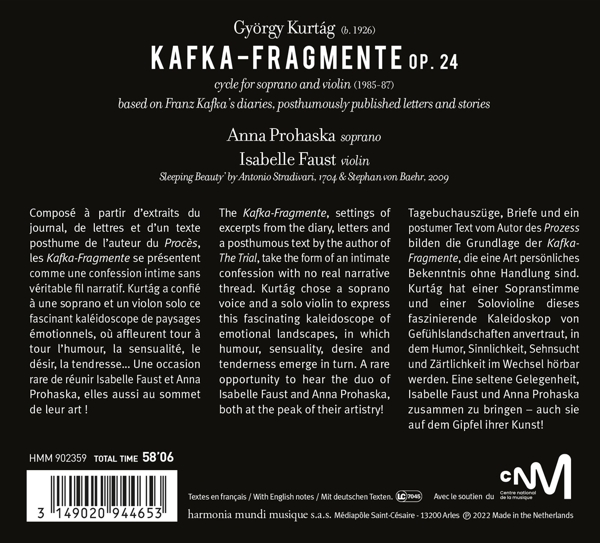 Beschreibung: | Runningtime: 00:00:00, Composed By: György Kurtág, Design [Maquette]: Atelier Harmonia Mundi, Engineer [Prise De Son]: Julian Schwenkner, Liner Notes: Anne Do Paço, Liner Notes [Traduction]: Laurent Cantagrel, Liner Notes [Translation]: Charles Johnston, Realization [Réalisation], Producer [Direction Artistique], Edited By [Montage]: Martin Sauer, Soprano Vocals: Anna Prohaska, Text By: Elias Canetti, Text By: Franz Kafka, Violin ['Sleeping Beauty' By Antonio Stradivari]: Isabelle Faust, Labelcode HMM 902359, Phonographic Copyright (p) Harmonia Mundi Musique S.a.s., Copyright (c) Harmonia Mundi, Copyright (c) UMP Editio Musica Budapest, Copyright (c) Marco Borggreve, Copyright (c) Andrea Felvégi, Recorded At Teldex Studio, Berlin |