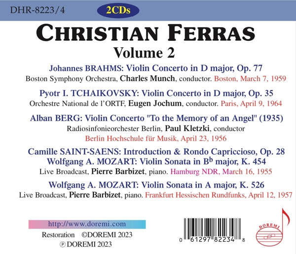 | Beschreibung: | When Christian Ferras died at age 49. His friend and colleague Yehudi Menuhin wrote that Ferras was "possessed by music, immensely talented, and of both a generous and intense temperament." Christian Ferras was one of the greatest violinists of the 20th century. Born in 1933, he was a guest soloist of the Nice Symphony orchestra in1942. In 1948 he won the First Prize at the International Scheveningen (Holland) Violin Competition and in 1949 won the top prize at the International Long-Thibaud Competition. Thereafter, he pursued a successful career as soloist with many of the world's leading orchestras and in recitals with his long time accompanist, pianist Pierre Barbizet. He recorded for EMI and from 1964 for DG where he recorded the four main repertoire violin concertos, Brahms, Sibelius, Beethoven and Tchaikovsky, with Herbert von Karajan and the Berlin Philharmonic Orchestra. Fortunately, Christian Ferras left behind a rich recorded legacy, that enable us to continue to enjoy his great artistry., Runningtime: 00:00:00, Labelcode DHR8223 |