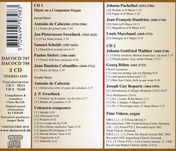 : Music On A Compenius Organ () : Sacred Music () 1-1: Tiento Del Primer Tono (1:44) 1-2: O Lux Beata Trinitas (3:58) 1-3: Magnificat Secundi Toni (6:19) 1-4: Choral With Four Variations (4:26) 1-5: Tiento de Falsas (2:50) : Secular Music () 1-6: Difrerencias Sobre El Canto Del Caballero (3:27) 1-7: Fantasie Op de Manier van én Echo (3:17) 1-8: Baletto Del Granduca (4:28) 1-9: Intrada (0:56) 1-10: Allemande (0:40) 1-11: Proportz (0:42) 1-12: La Corante Du Roy (0:40) 1-13: Ein Schöner Englischer Tantz (0:59) 1-14: Spaniol Kochersperg (1:59) 1-15: Herzok Moritz Tantz (0:42) 1-16: Ungarescha (0:41) 1-17: Saltarello (0:42) 1-18: Prelude In D Minor (5:34) 1-19: Fugue In D Minor (2:50) 1-20: Suite In D Major (10:23) 1-21: Magnificat In D Major (8:35) 1-22: Dialogue In C Major (8:54) 2-1: Choral Variation: Meinen Jesum Lass' Ich Nicht (7:37) 2-2: Choral Partita: Jesu, Meine Freude (15:52) : Choral Variations () 2-6: Introduction Et Allegro Moderato (1917) (9:07) : Trois...(1919) ()