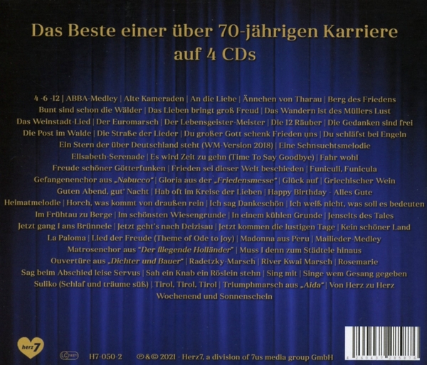 ?Das Beste? ist eine umfassende CD-Sammlung von Gotthilf Fischer, einem der bekanntesten deutschen Chorleiter und Arrangeure. Dieses Album vereint einige seiner schönsten Werke und präsentiert die zeitlose Schönheit sowie den mitreißenden Geist traditioneller deutscher Volkslieder und Chormusik. Gotthilf Fischer erlangte internationale Berühmtheit mit den ?Fischer-Chören?, die weltweit bei Großveranstaltungen wie Olympischen Spielen oder Weltausstellungen das Publikum begeisterten. Für sein Engagement zur Bewahrung des musikalischen Erbes wurde er vielfach ausgezeichnet. Die CD wird vom Hersteller Herz7 - 7us media group gmbh produziert ? ein renommiertes Label mit langjähriger Erfahrung im Musikgeschäft und einer Leidenschaft für hochwertige Produktionen verschiedenster Genres. Herz7 unterstützt sowohl etablierte Künstler als auch Newcomer und steht für exzellente Klangqualität sowie künstlerische Vielfalt.