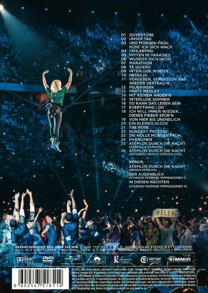 01. "Ouvertüre Farbenspiel (Live in Berlin / 2015)" 02. "Unser Tag (Live in Berlin / 2015)" 03. "Und morgen früh küss' ich dich wach (Live in Berlin / 2015)" 04. "Fehlerfrei (Live in Berlin / 2015)" 05. "Mitten im Paradies (Live in Berlin / 2015)" 06. "Wunder dich nicht (Live in Berlin / 2015)" 07. "Marathon (Live in Berlin / 2015)" 08. "Te Quiero (Live in Berlin / 2015)" 09. "Interlude Winter (Live in Berlin / 2015)" 10. "Nessaja (Live in Berlin / 2015)" 11. "Vergeben, vergessen und wieder vertrau'n (Live in Berlin / 2015)" 12. "Feuerwerk (Live in Berlin / 2015)" 13. "Party Medley (Live in Berlin / 2015)" 14. "Mit keinem Ander'n (Live in Berlin / 2015)" 15. "Interlude Sommer (Live in Berlin / 2015)" 16. "So kann das Leben sein (Live in Berlin / 2015)" 17. "Everything I Do (Live in Berlin / 2015)" 18. "Ich will immer wieder dieses Fieber spür'n (Live in Berlin / 2015)" 19. "Von hier bis unendlich (Live in Berlin / 2015)" 20. "Ein kleines Glück (Live in Berlin / 2015)" 21. "The Rose (Live in Berlin / 2015)" 22. "Hundert Prozent (Live in Berlin / 2015)" 23. "Die H?lle morgen früh (Live in Berlin / 2015)" 24. "Ph?nomen (Live in Berlin / 2015)" 25. "Atemlos durch die Nacht (Acapella-Version / Live in Berlin / 2015)" 26. "Atemlos durch die Nacht (Extended Dance-Version 2015 / Live in Berlin / 2015)" 27. "Atemlos durch die Nacht (Regen-Version / Live in Berlin / 2015)" 28. "Der Augenblick (Stadion-Tournee Impressionen I) (Live / 2015)" 29. "In diesen N?chten (Stadion-Tournee Impressionen II) (Live / 2015)" 30. "Menü / Helene Fischer / Farbenspiel Live - Die Stadion-Tournee"
